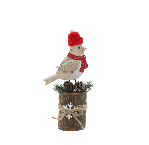 Festive MagicProduct Code: P039557 23cm wooden bird with red hat and scarf on a wooden base