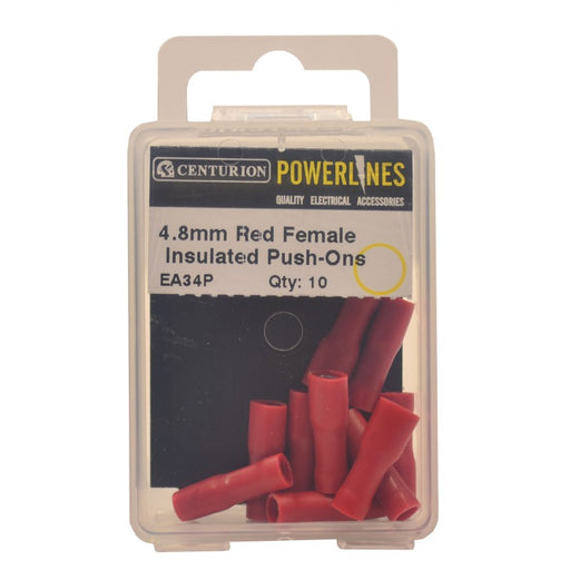 CenturionProduct Code: EA34P SIZE: 4.8mm width / 0.25 - 1.65mm2 conductor COLOUR: Red Female Pack of 10 For use with male insulated push ons EA39P and EA57...