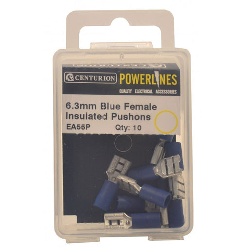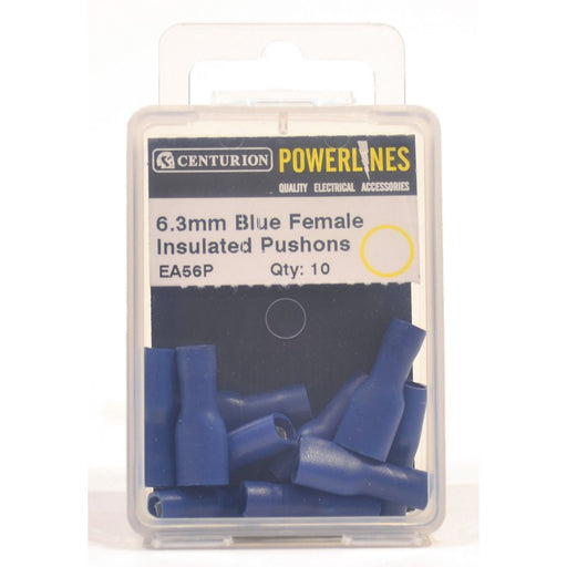 CenturionProduct Code: EA56P SIZE: 6.3mm width / 1.04 - 2.63mm2 conductor COLOUR: Blue Female Pack of 10 For use with male insulated push ons EA39P and EA5...