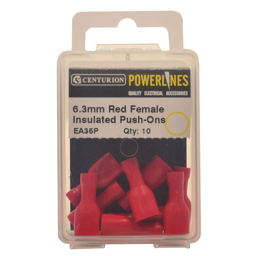 CenturionProduct Code: EA35P SIZE: 6.3mm width / 0.25 - 1.65mm2 conductor COLOUR: Red Female Pack of 10 For use with male insulated push ons EA39P and EA57...