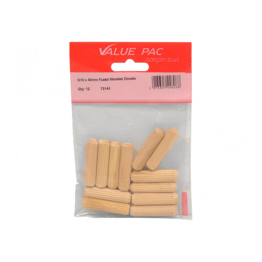 Value PacProduct Code: 72143 Inner Pack Quantity: 12 M10 x 40mm Fluted Wooden Dowels