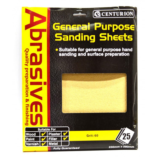 CenturionProduct Code: SA05L Inner Pack Quantity: 25 SIZE: 230 x 280cm BRAND: Abrasives Pack of 25 M2 / 60 grit Suitable for general purpose hand sandin...