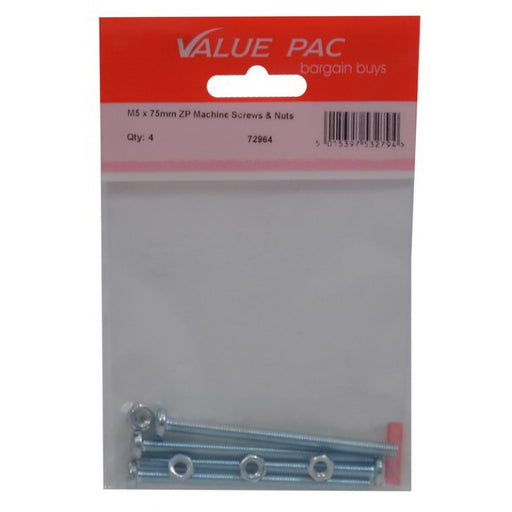 Value PacProduct Code: 72964 Inner Pack Quantity: 4 M5 x 75mm ZP Machine Screws & Nuts 4pk