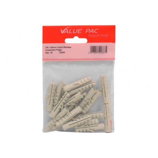Value PacProduct Code: 72234 Inner Pack Quantity: 18 M8 x 40mm Nylon Rimless Expansion Plugs