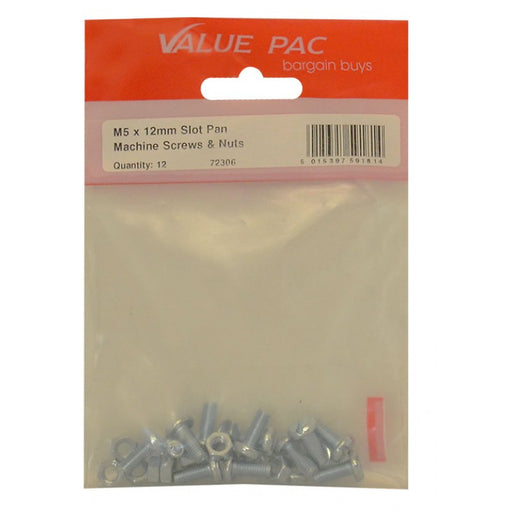 Value PacProduct Code: 72306 Inner Pack Quantity: 12 M5 x 12mm ZP Machine Screws & Nuts