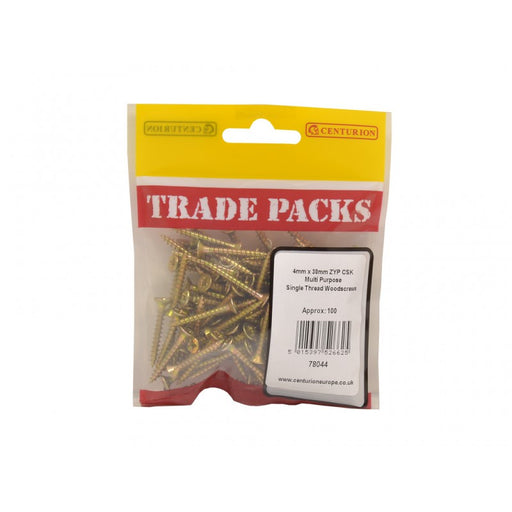 Trade PacksProduct Code: 78044 Inner Pack Quantity: 100 SIZE: 4 x 30mm COLOUR: Zinc Yellow Passivated finish BRAND: TRADE PACKS Suitable for use with many ma...