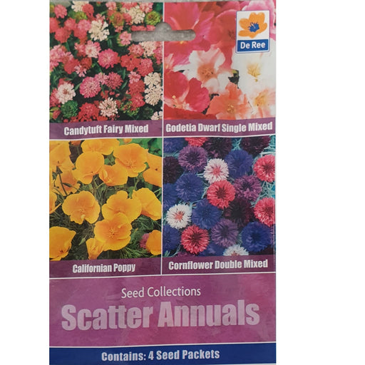 De ReeSeed Collections Scatter Annuals Contains: 4 Seed Packets Outdoor Planting: Cornflower & Candytuft Fairy: March - May Godetia: March - Apri...