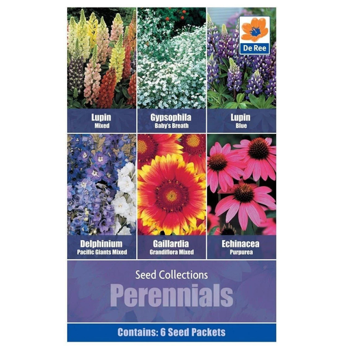 De ReeContains 6 Seed Packets Lupin Mixed Gypsophila (Baby's Breath) Lupin Blue Delphinium (Pacific Giants Mixed) Gaillardia (Grandiflora Mixed) Echinac...