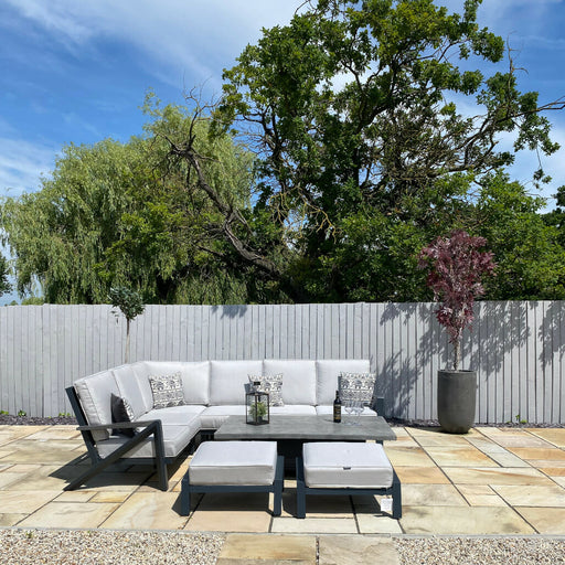 Generously stuffed upholstery, Shower proof cushions, Hand painted finish on table and arms of chairs, Large stools for additional seating, 100% a...